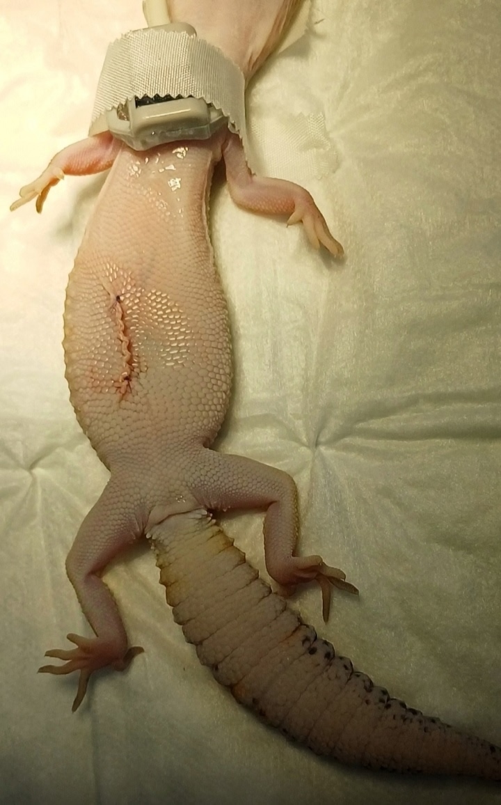 На фото из практики видно послеоперационный шов на коже ящерицы и удалённые фолликулы.