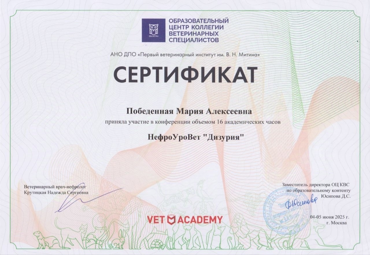 Специализация: терапия, нефрология, урология, дерматология, инфекционные заболевания, лабораторная диагностика, общая хирургия, стоматология собак и кошек.