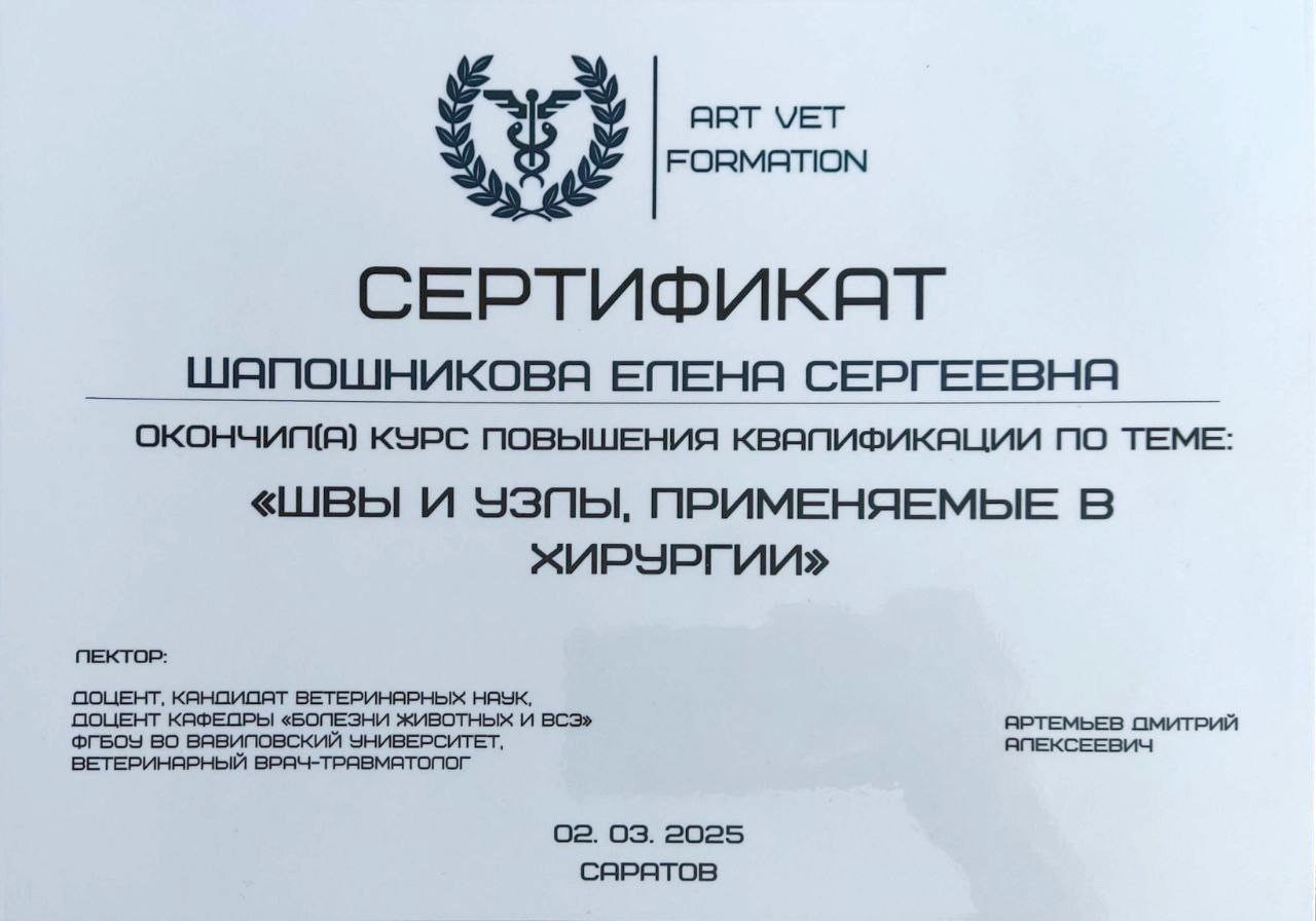 Елена Сергеевна является выпускницей факультета ветеринарной медицины ФГБОУ ВО «Вавиловский университет». Специализируется на болезнях мелких непродуктивных животных, с профессиональным интересом к общей хирургии и стоматологии собак и кошек.