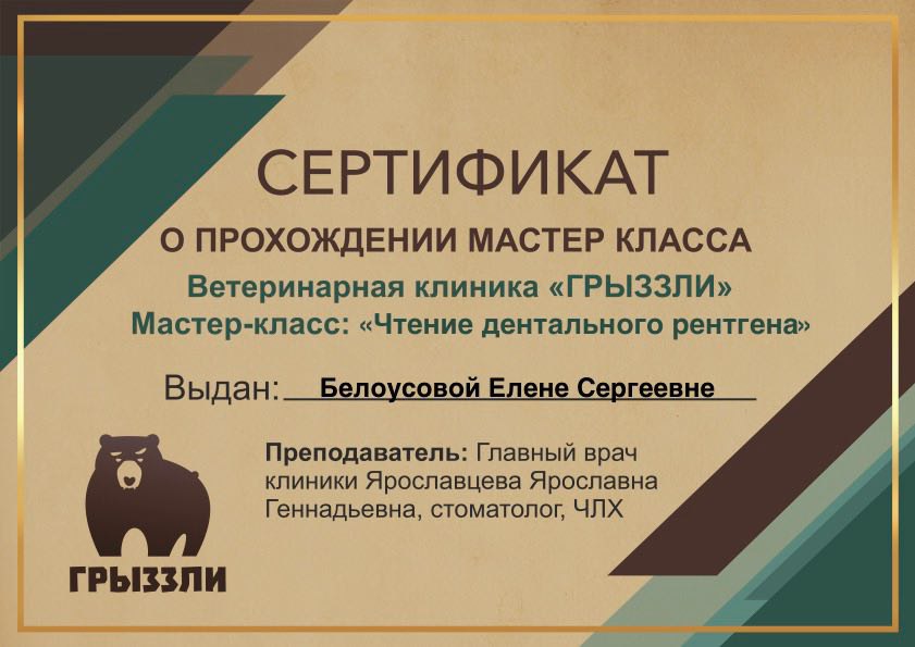 Специализация: терапия, общая хирургия, стоматология собак и кошек.